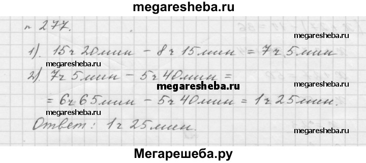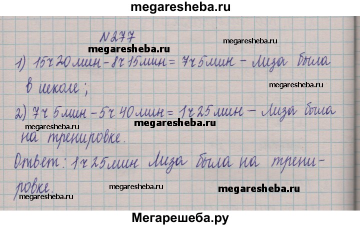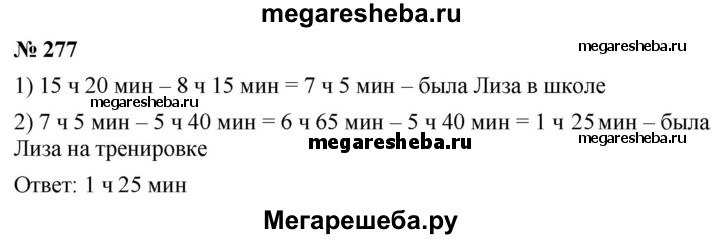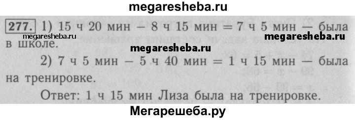 277. Лиза была в школе с 8 ч 15 мин до 15 ч 20 мин. Вечером она пошла на тренировку. Там она провела на 5 ч 40 мин меньше времени, чем в школе. Сколько времени Лиза была на тренировке?