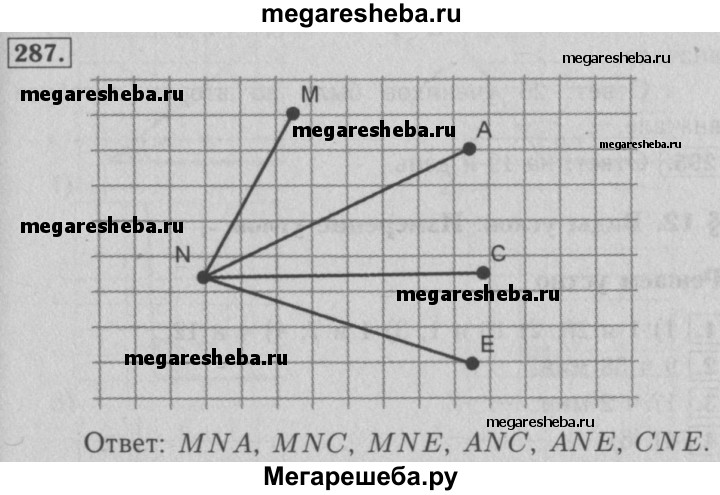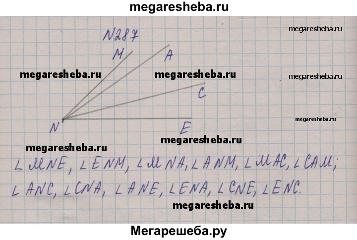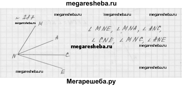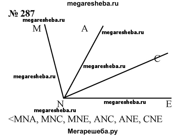 287. Начертите ∠ MNE и проведите лучи NA и NC между его сторонами. Запишите все образовавшиеся углы.