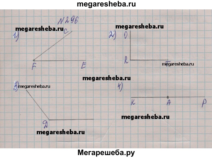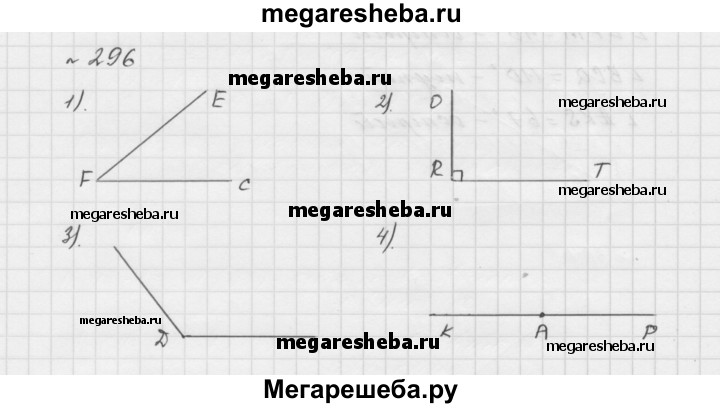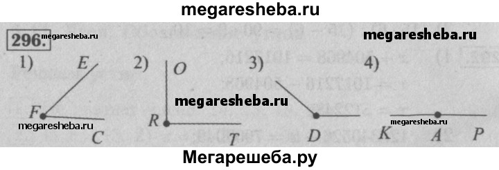 296. Начертите: 1) острый угол EFC; 2) прямой угол ORT; 3) тупой угол D; 4)развёрнутый угол КАР.