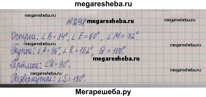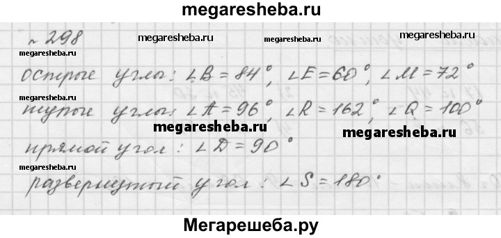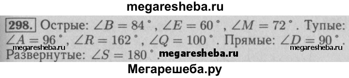 298. Какие из данных углов острые, тупые, прямые, развёрнутые: ∠A= 96°, ∠B = 84°, ∠S= 180°, ∠D= 90°, ∠R- 162°, ∠E = 60°, ∠Q = 100°, ∠M = 72°?