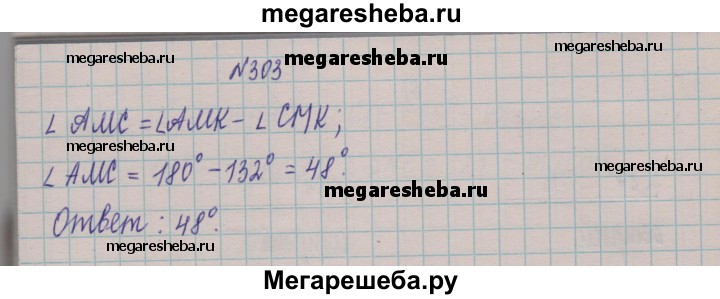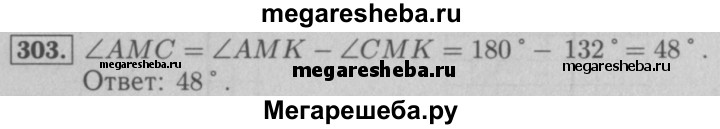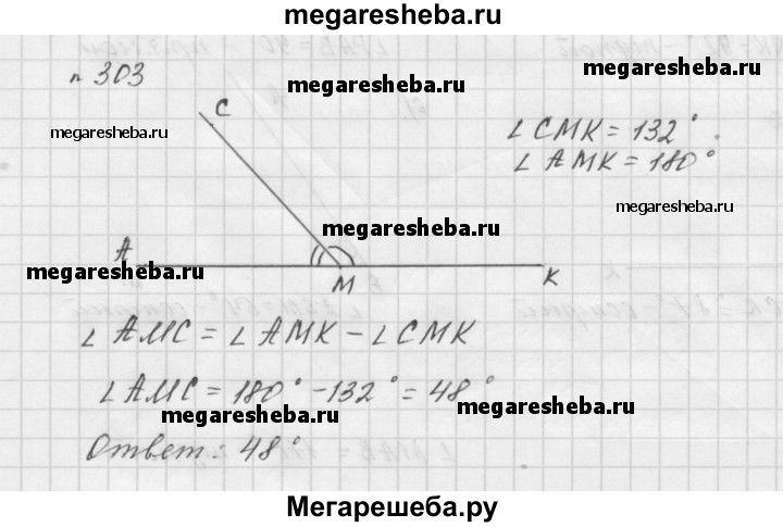 303. На рисунке 96 ∠CMK = 132°, а угол АМК — развёрнутый. Вычислите величину угла AMС.