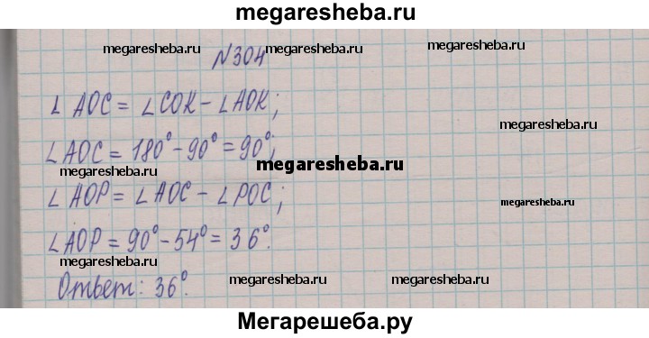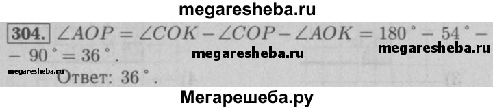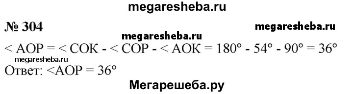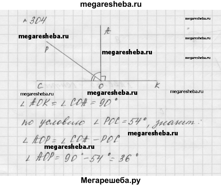 304. На рисунке 97 угол АОК — прямой, ∠РОС = 54°, а угол СОК — развёрнутый. Вычислите величину угла АОР.