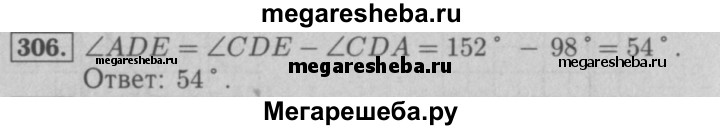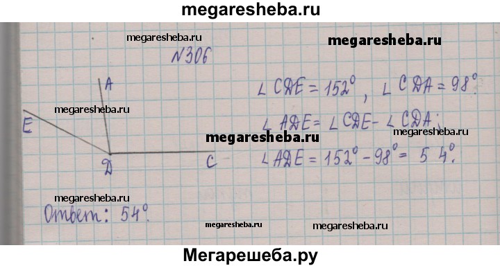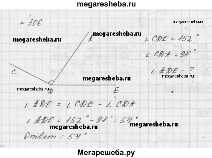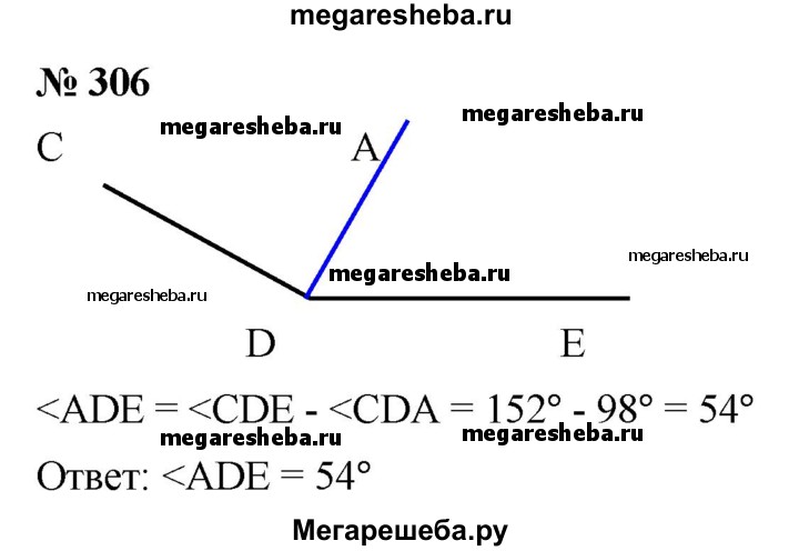 306. Начертите угол СDЕ, равный 152°. Лучом DA разделите этот угол на два угла так, чтобы ∠СDА = 98°. Вычислите величину угла ADE.