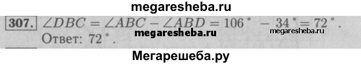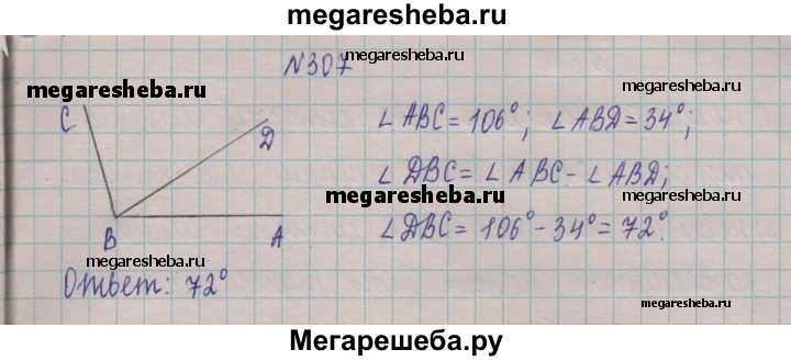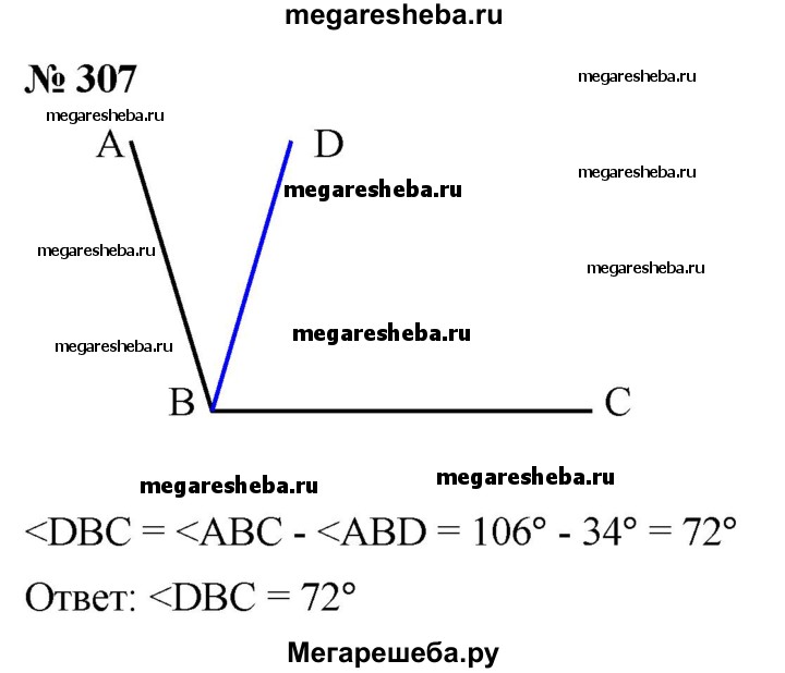 307. Начертите угол ABC, равный 106°. Лучом ВD разделите этот угол на два угла так, чтобы ∠ABD = 34°. Вычислите величину угла DBC.