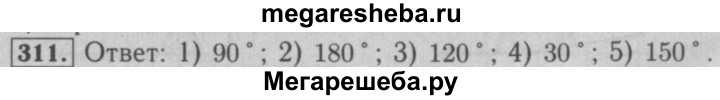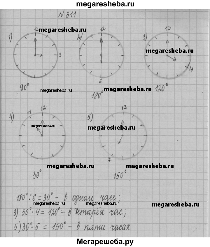 311. Найдите градусную меру угла между стрелками часов, если они показывают: 1) 3 ч; 2) 6 ч; 3) 4 ч; 4) 11 ч; 5) 7 ч.