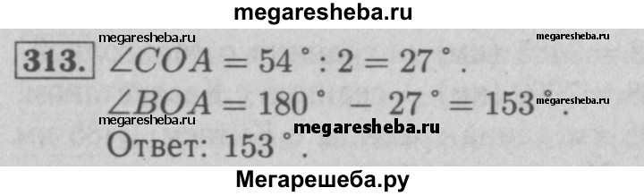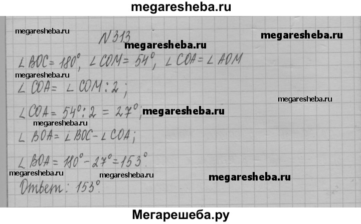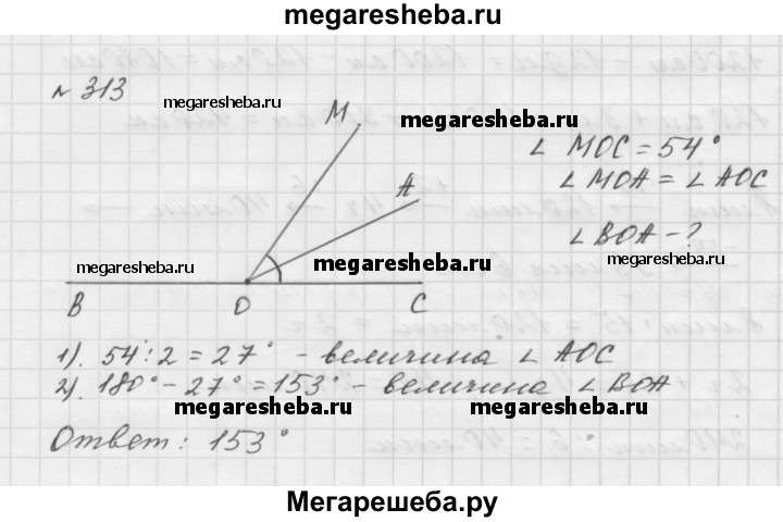 313. Луч OA является биссектрисой угла СОМ, ∠ СОМ - 54° (рис. 101, 6). Вычислите градусную меру угла BOA.