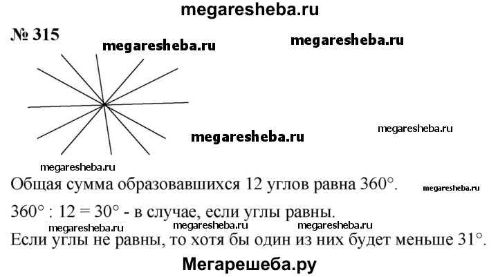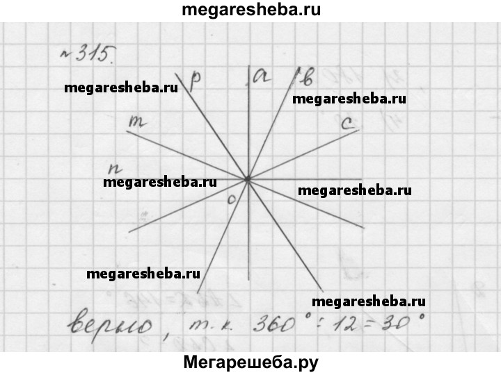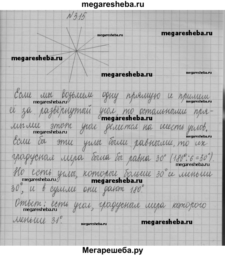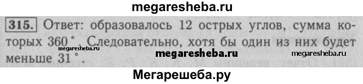 315. Проведите шесть прямых, пересекающихся в одной точке. Верно ли, что среди образовавшихся при этом углов есть угол, градусная мера которого меньше З1°?