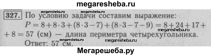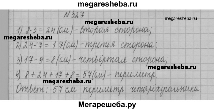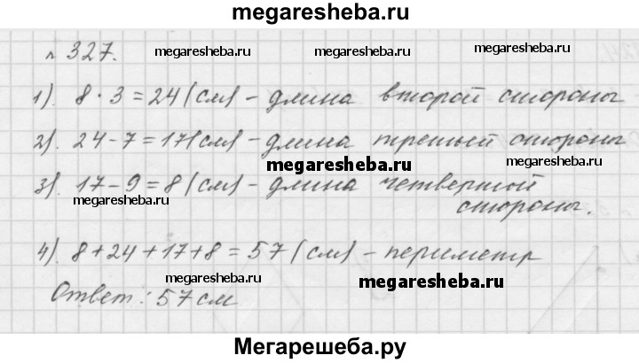 327. Одна из сторон четырёхугольника равна 8 см, вторая сторона в 3 раза больше первой, а третья — на 7 см меньше второй и на 9 см больше четвёртой. Вычислите периметр четырёхугольника.