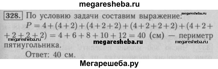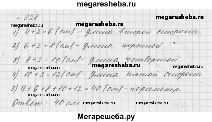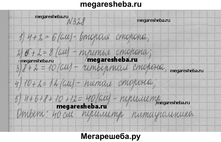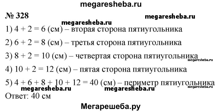 328. Стороны пятиугольника пронумеровали. Первая сторона равна 4 см, а каждая следующая сторона на 2 см длиннее предыдущей. Вычислите периметр пятиугольника.