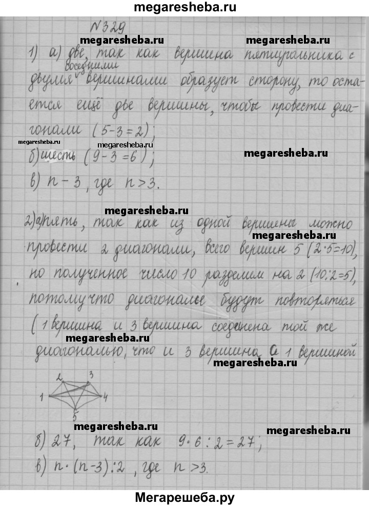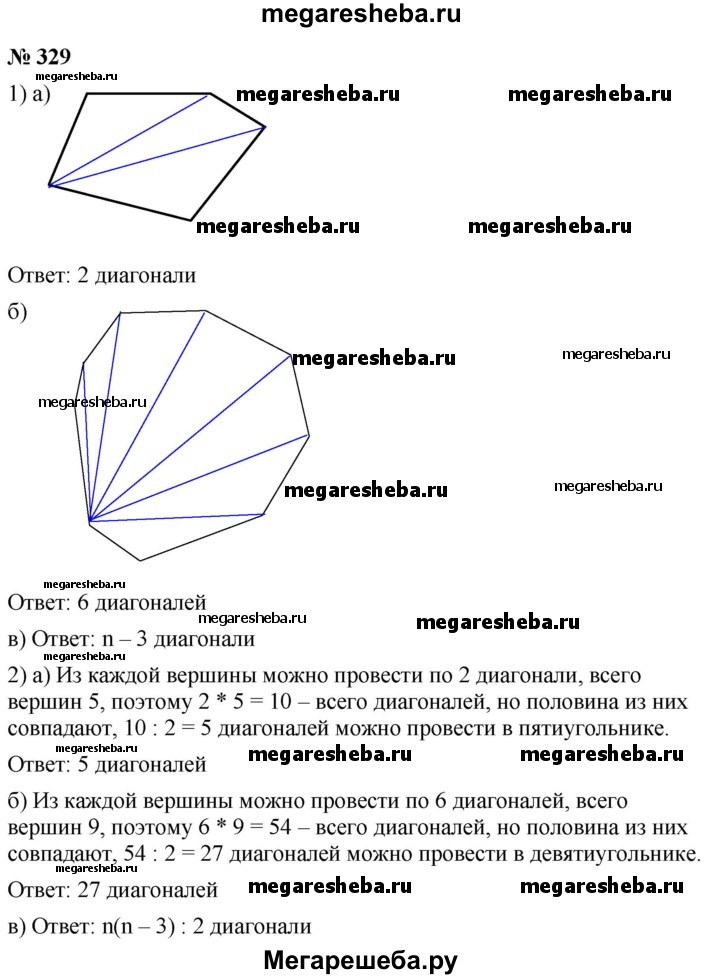 329. 1) Сколько диагоналей можно провести из одной вершины: а) пятиугольника; б) девятиугольника; в) в n-угольнике, где n > 3? 2) Сколько всего диагоналей можно провести: а) в пятиугольнике; б) в девятиугольнике; в) в n-угольнике, где n > 3?