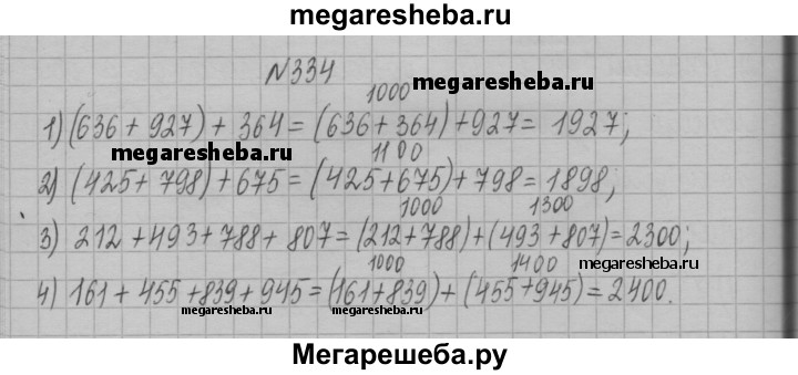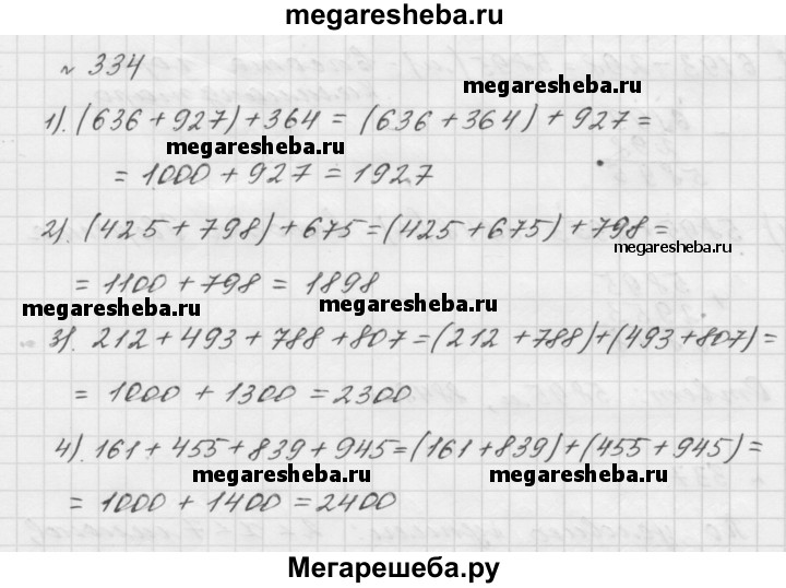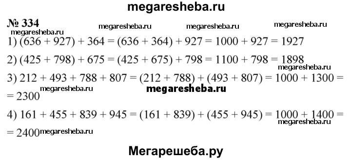 334. Выполните сложение, выбирая удобный порядок вычислений: 1) (636 + 927) + 364; 2) (425 + 798) + 675; 3) 212 + 493 + 788 + 807; 4) 161 + 455 + 839 + 945.
