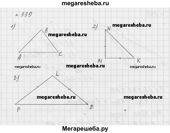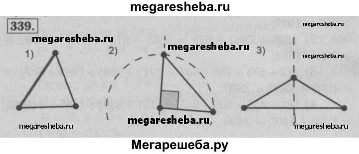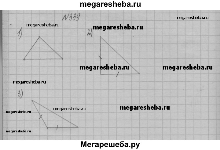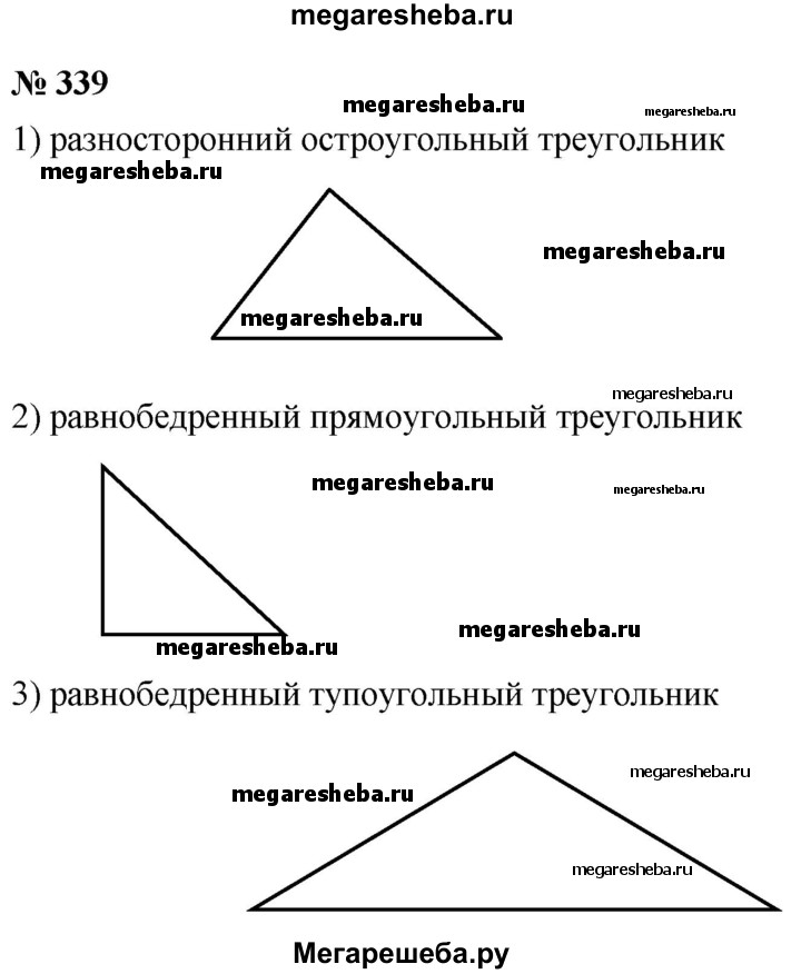 339. Начертите: 1) разносторонний остроугольный треугольник; 2) равнобедренный прямоугольный треугольник; 3) равнобедренный тупоугольный треугольник.
