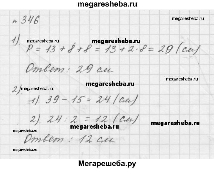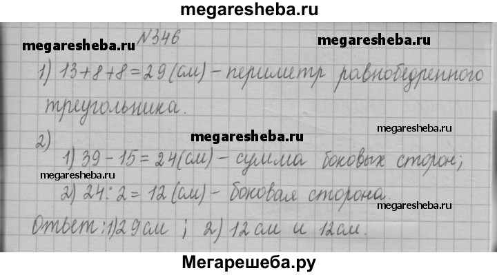 346. 1) Найдите периметр равнобедренного треугольника, основание которого равно 13 см, а боковая сторона — 8 см. 2) Периметр равнобедренного треугольника равен 39 см, а основание — 15 см. Найдите боковые стороны треугольника