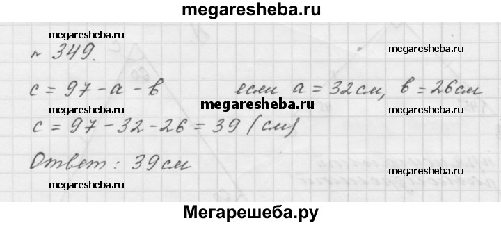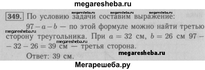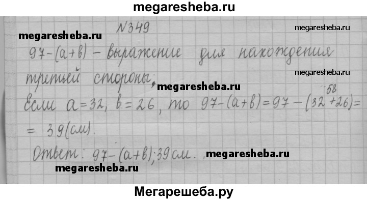 349. Периметр треугольника равен 97 см, одна сторона — а см, вторая — b см. Составьте выражение для нахождения третьей стороны. Вычислите длину третьей стороны, если а = 32, b = 26.