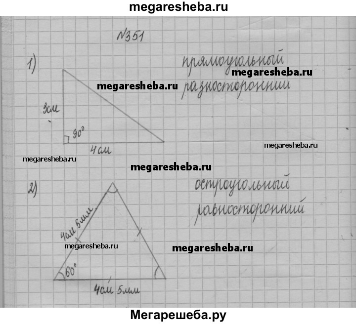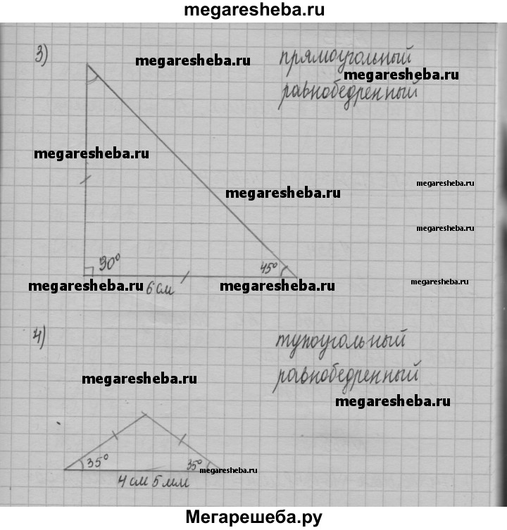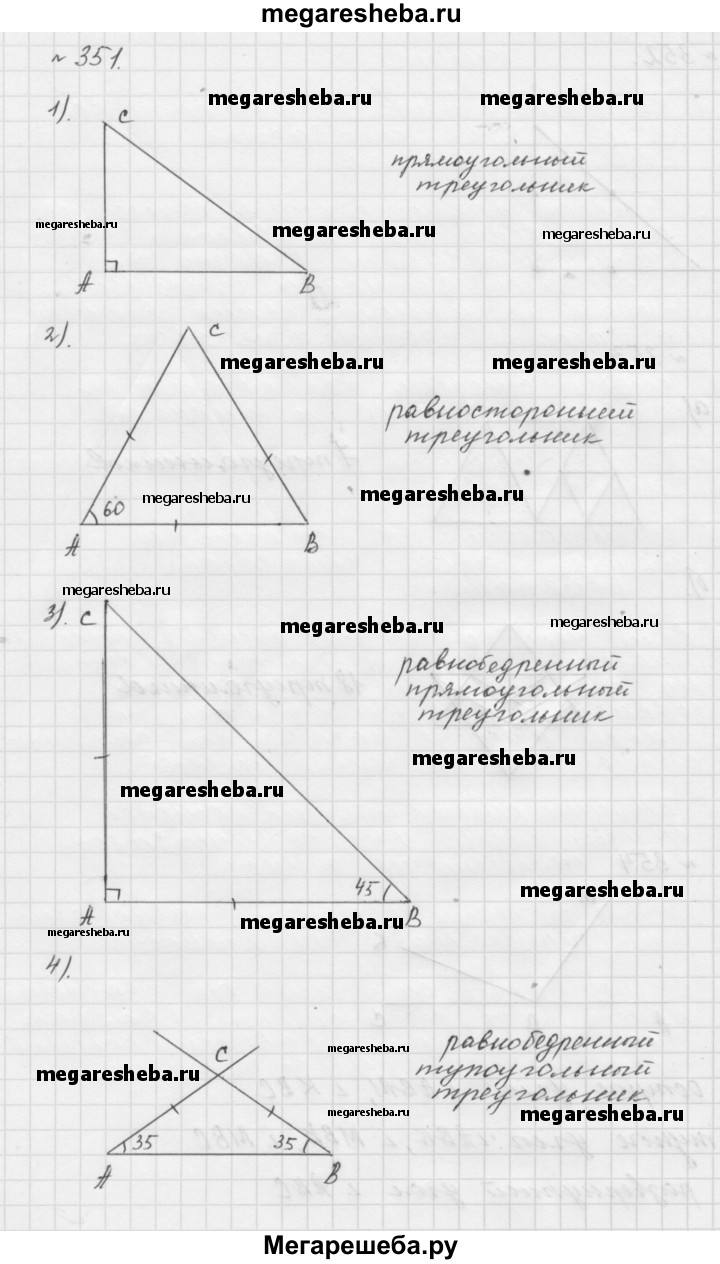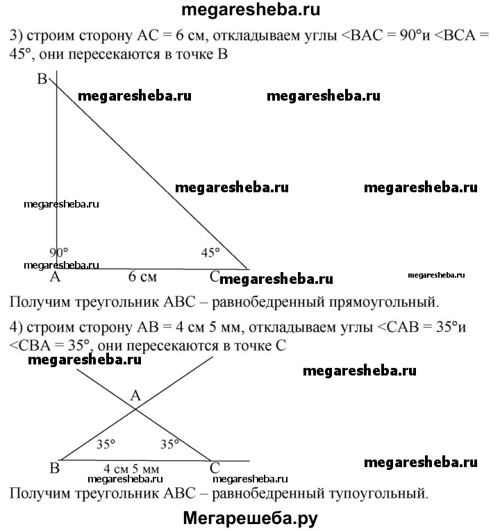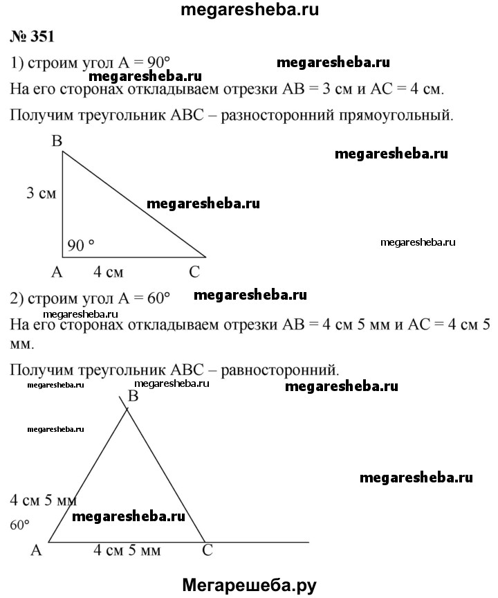 351. С помощью линейки и транспортира постройте треугольник и укажите его вид, если: 1) две стороны равны 3 см и 4 см, а угол между ними — 90°; 2) две стороны равны по 4 см 5 мм, а угол между ними — 60°; 3) одна сторона равна 6 см, а углы, прилежащие к этой стороне, — 90° и 45°; 4) одна сторона равна 4 см 5 мм, а углы, прилежащие к этой стороне, — по 35°.