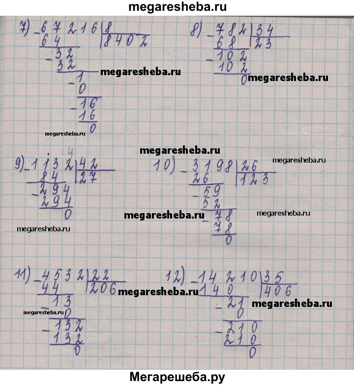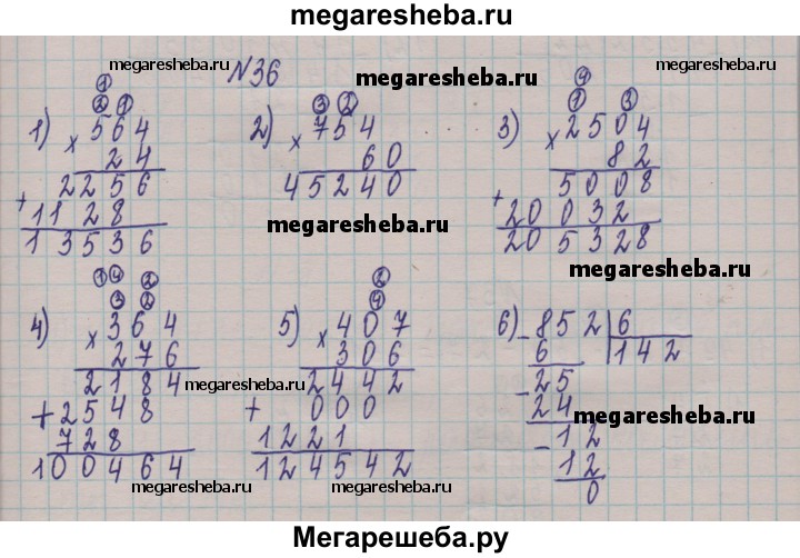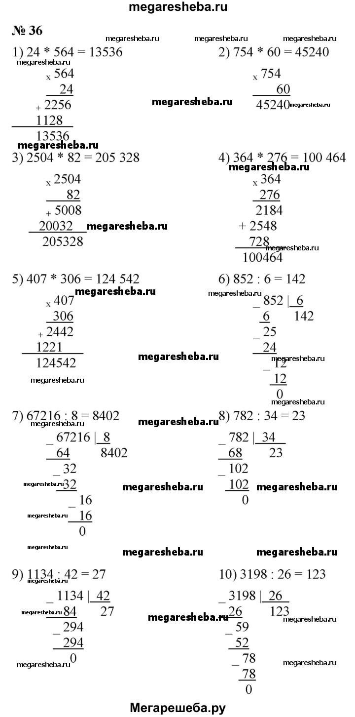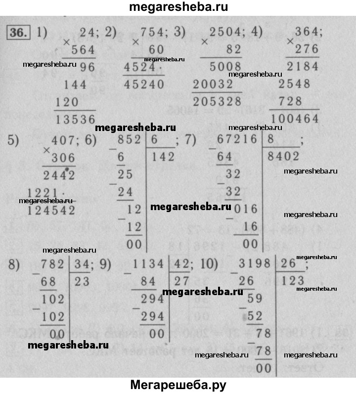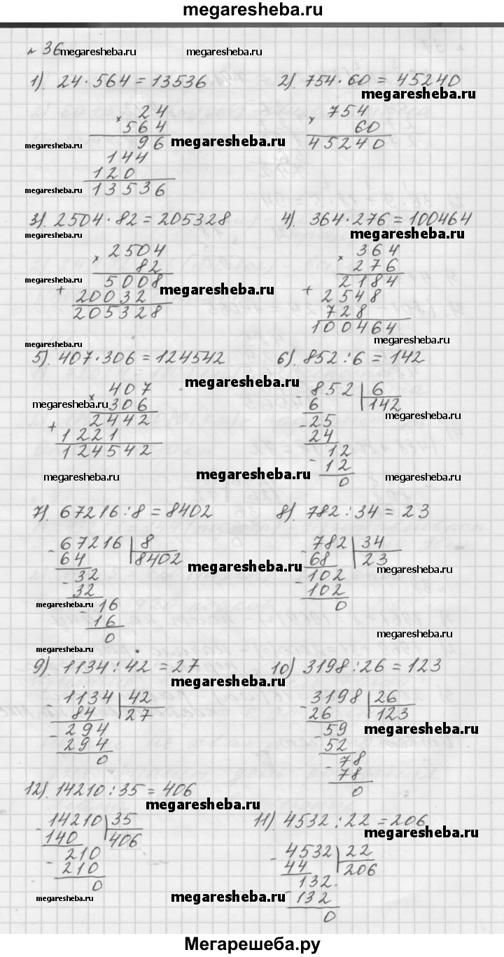 36. Вычислите: 1) 24 • 564; 2) 754 • 60; 3) 2 504 • 82; 4) 364 • 276; 5) 407 • 306; 6)852 : 6; 7)67 216 : 8; 8) 782 : 34; 9) 1 134 : 42 10)3 198 : 26 11) 4 532 : 22; 12) 14 210 : 35.