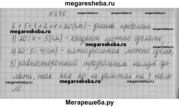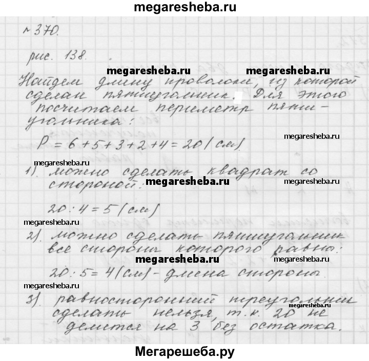 370. Из куска проволоки сделали модель пяти угольника (рис. 138). Какие из моделей перечисленных фигур, длины сторон которых выражаются натуральным числом сантиметров, можно сделать из этого куска проволоки: 1) квадрат; 2) пятиугольник, все стороны которого равны; 3) равносторонний треугольник?