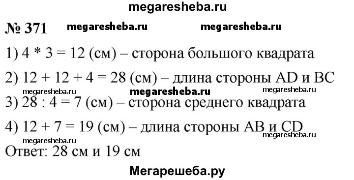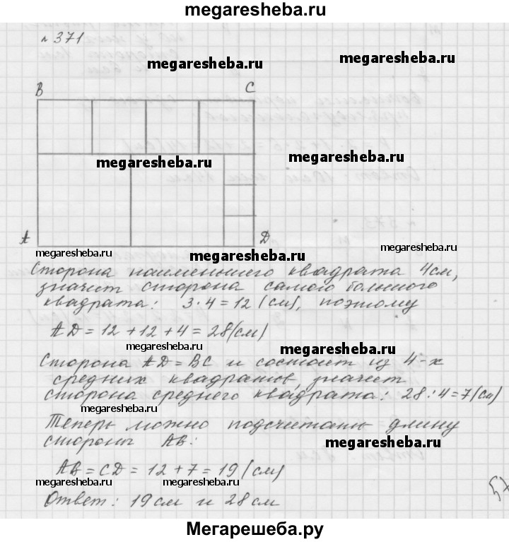 371. Прямоугольник ABCD разрезали на квадраты так, как показано на рисунке 139. Сторона наименьшего из квадратов равна 4 см. Найдите длины сторон прямоугольника ABCD.
