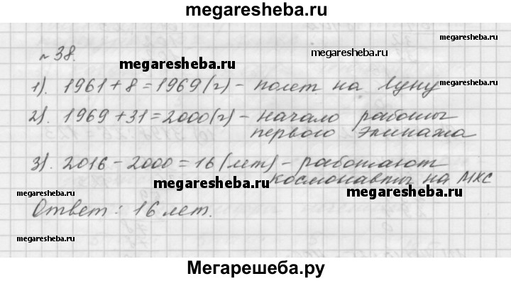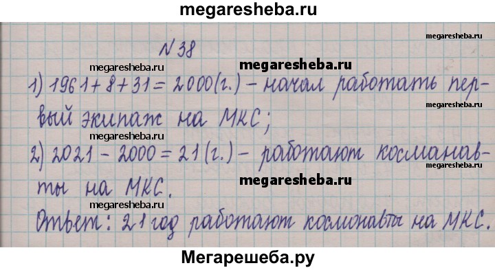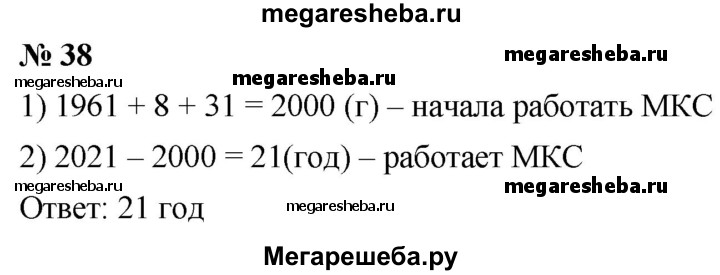 38. Первый полёт в космос совершил в 1961 г. гражданин Советского Союза Юрий Гагарин. Через восемь лет после этого на Луну ступил первый человек — гражданин США Нейл Армстронг. Ещё через 31 год на Международной космической станции (МКС) начал работать первый экипаж. Сколько лет работают космонавты на МКС?