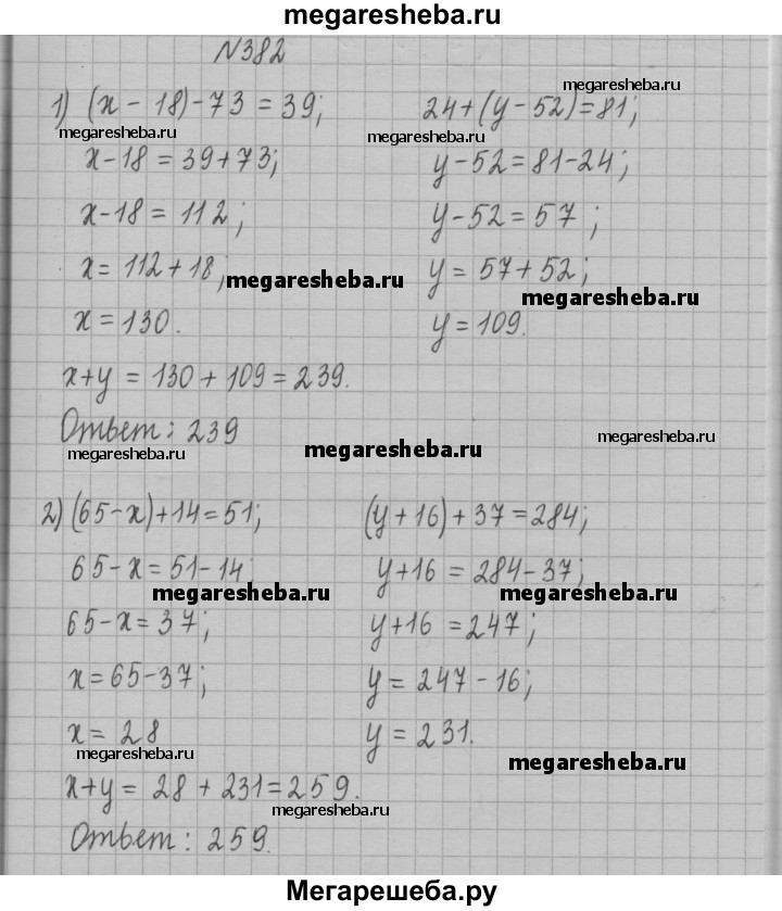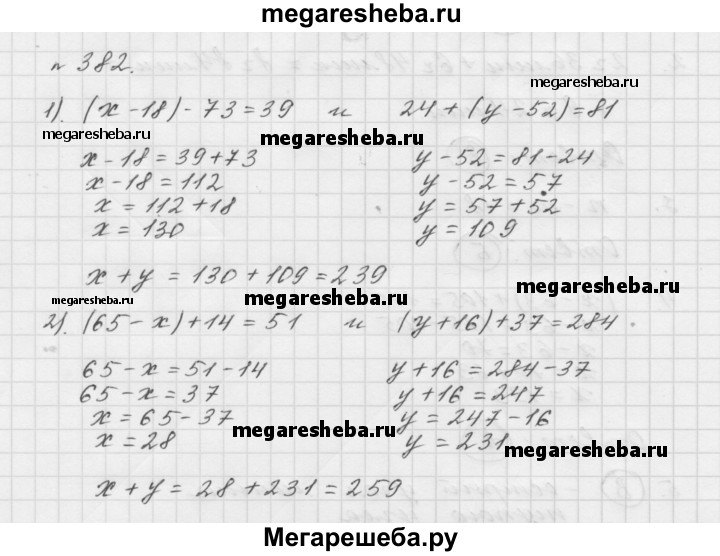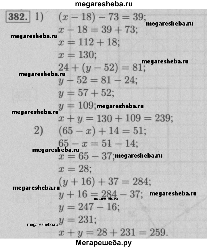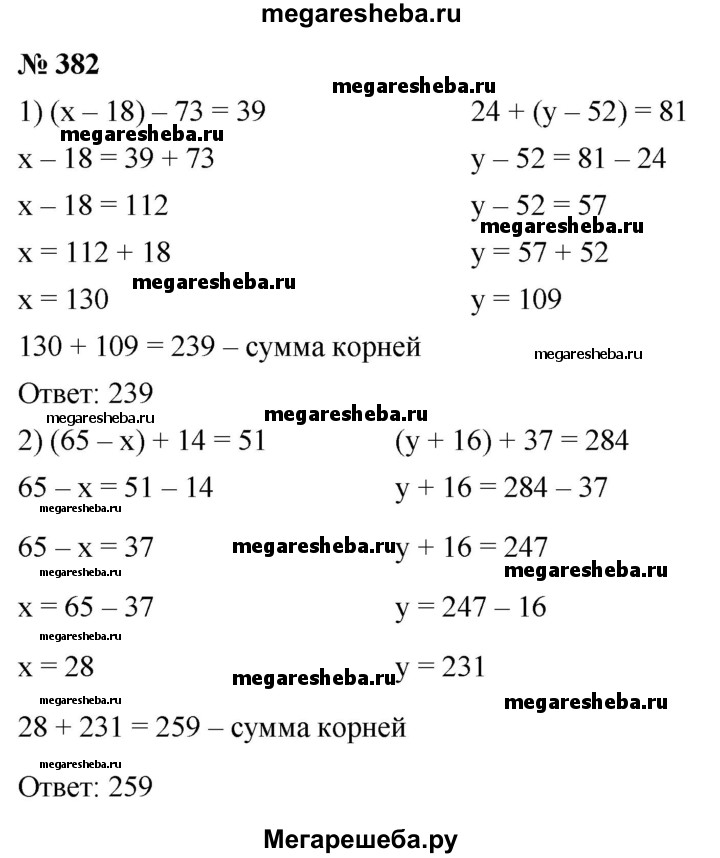 382. Найдите сумму корней уравнений: 1) (х - 18) - 73 = 39 и 24 + (у - 52) = 81; 2) (65 - х) +14 = 51 и (у + 16) + 37 = 284.