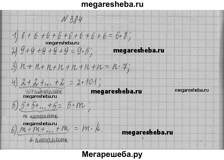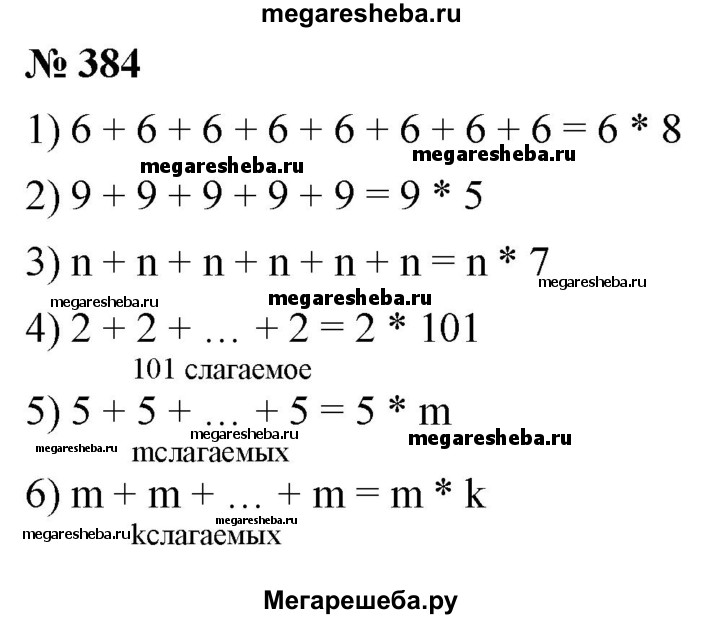 384. Запишите сумму в виде произведения: 1)6 + 6 + 6 + 6 + 6 + 6 + 6 + 6; 2) 9 + 9 + 9 + 9 +9; 3) п + п + п + п + п + п + п;