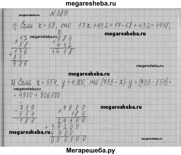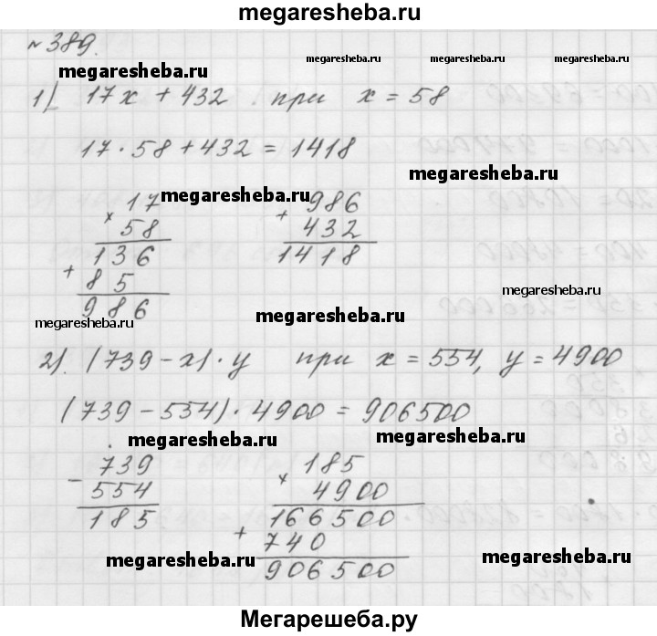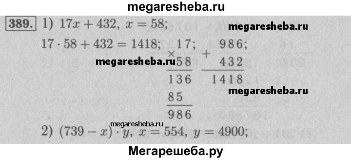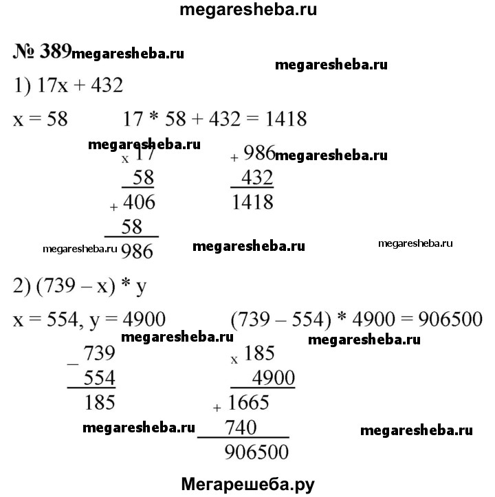 389. Вычислите значение выражения: 1) 17x +432, если x = 58; 2) (739 - х) • y, если х = 554, у = 4 900.