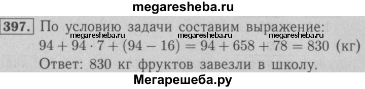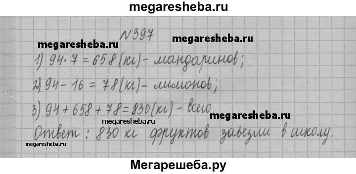 397. В школу завезли апельсины, мандарины и лимоны. Апельсинов было 94 кг, что в 7 раз меньше, чем мандаринов, и на 16 кг больше, чем лимонов. Сколько всего килограммов фруктов завезли в школу?