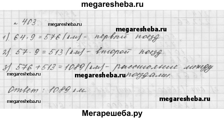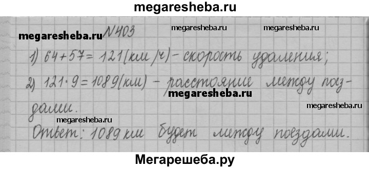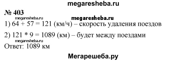 403. С одной станции в противоположных направлениях одновременно отправились два поезда. Один из них двигался со скоростью 64 км/ч, а второй — 57 км/ч. Какое расстояние будет между ними через 9 ч после начала движения?