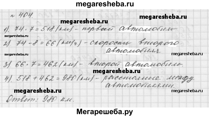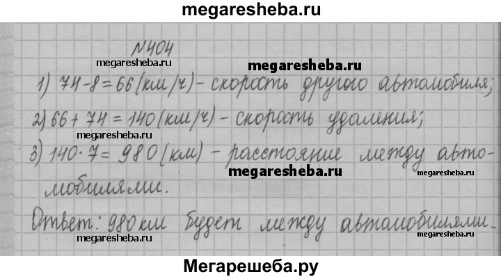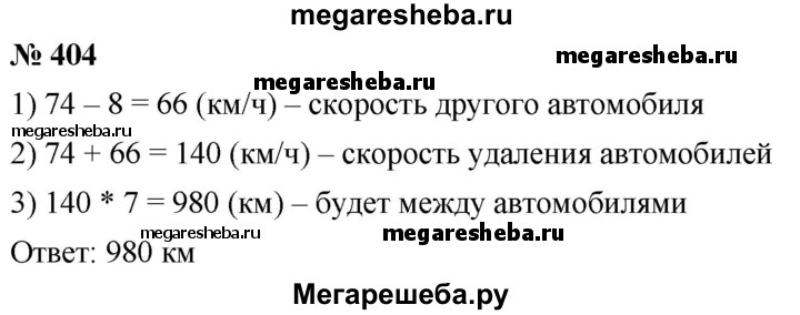 404. Из одного города в противоположных направлениях одновременно выехали два автомобиля. Скорость одного из них была 74 км/ч, что на 8 км/ч больше, чем скорость другого. Какое расстояние будет между ними через 7 ч после начала движения?