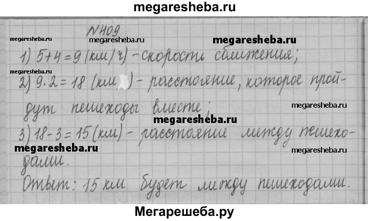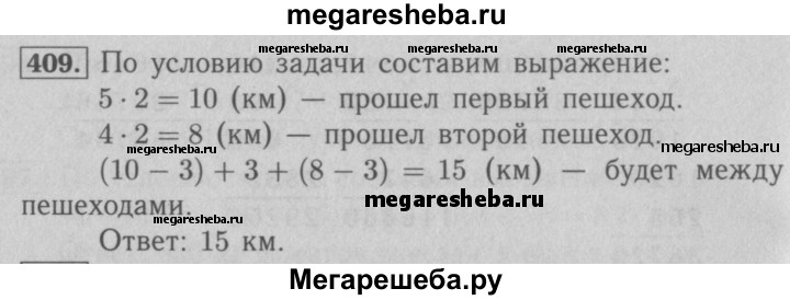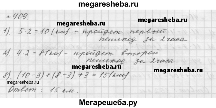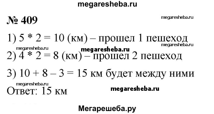 409. Из двух посёлков, расстояние между которыми равно 3 км, одновременно навстречу друг другу вышли два пешехода. Один из них двигался со скоростью 5 км/ч, а второй — 4 км/ч. Какое расстояние будет между пешеходами через 2 ч после начала движения?