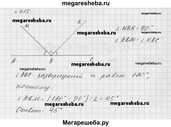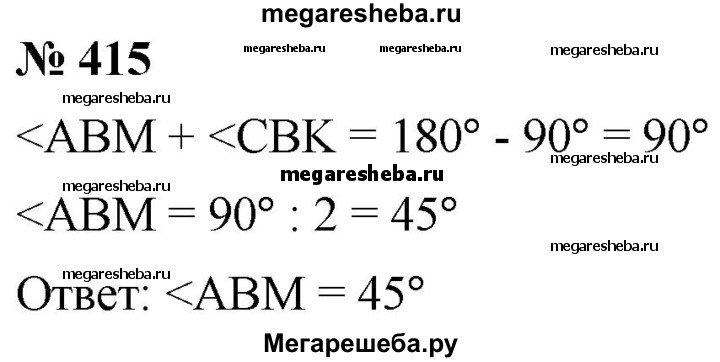 415. Найдите величину угла АВМ (рис. 141), если ∠ MBK — прямой и ∠ ABM = ∠ CBK.