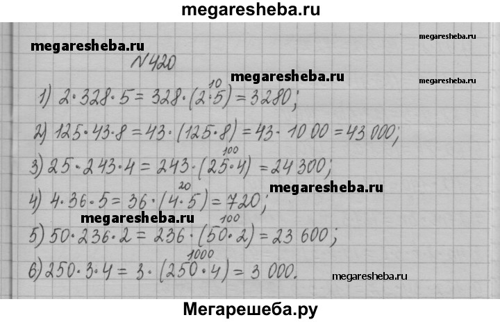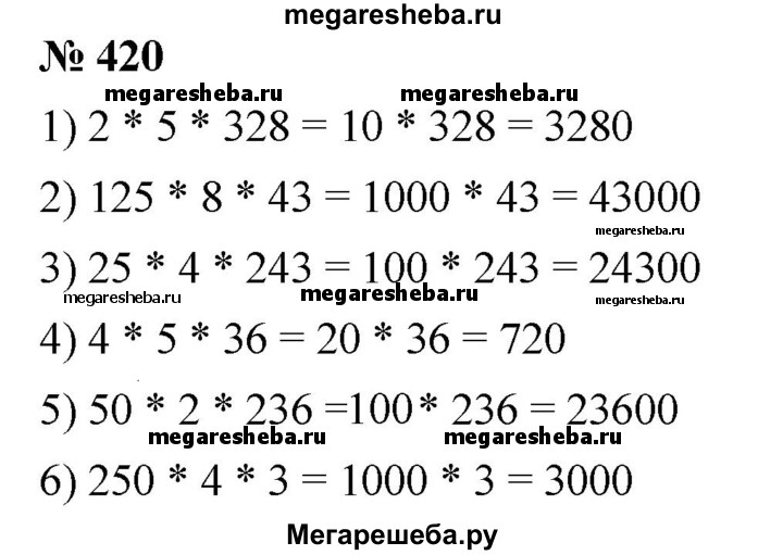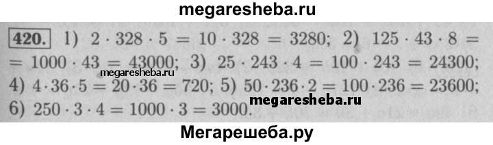 420. Вычислите удобным способом: 1) 2•328•5; 2) 125• 43 • 8; 3) 25•243•4; 4) 4• 36• 5; 5) 50•236•2; 6) 250 • 3 • 4.