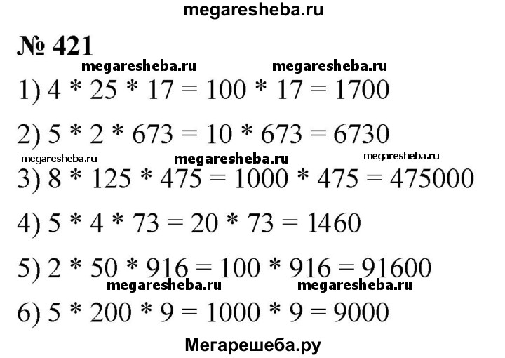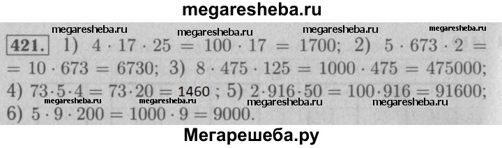 421. Вычислите удобным способом: 1) 4•17•25; 2) 5• 673 •2; 3) 8• 475• 125; 4) 73 • 5 • 4; 5) 2 • 916 • 50; 6) 5 • 9 • 200.