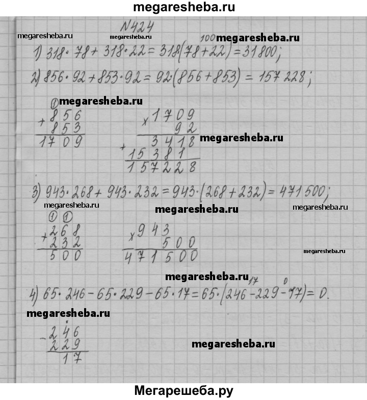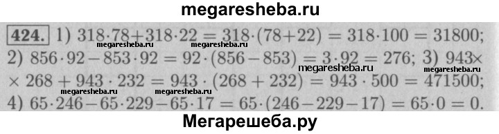 424. Вычислите значение выражения наиболее удобным способом: 1) 318 • 78 + 318 • 22; 2) 856 • 92 - 853 • 92; 3) 943 • 268 + 943 • 232; 4) 65 • 246 - 65 • 229 - 65 • 17.