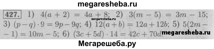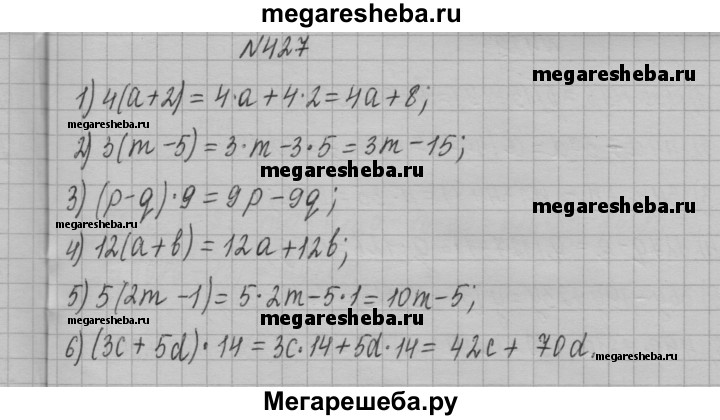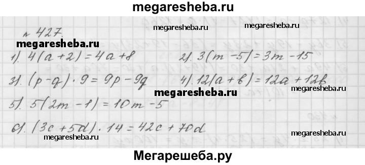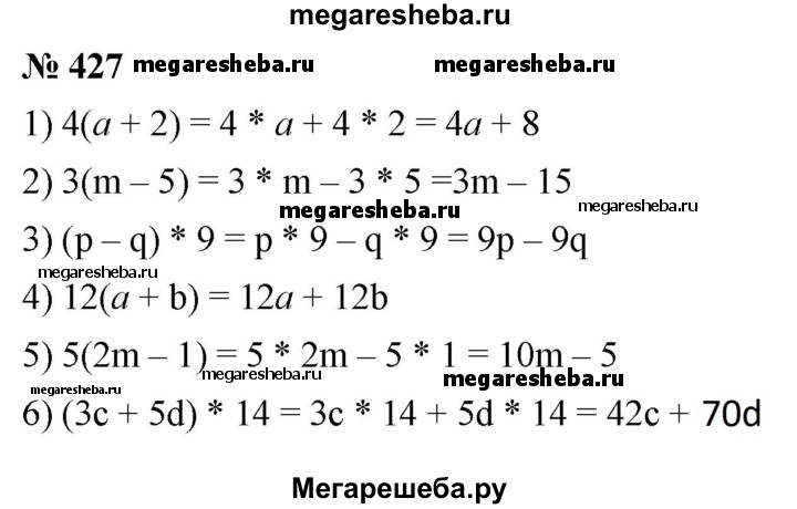 427. Раскройте скобки: 1) 4(а + 2); 2) 3(m - 5); 3) (p-q) • 9; 4) 12(а + b); 5) 5(2m- 1); 6) (3с + 5d) • 14.