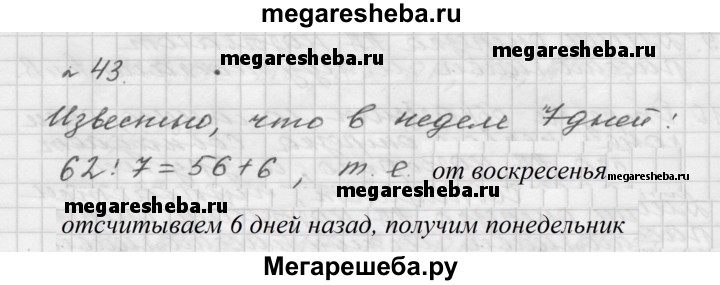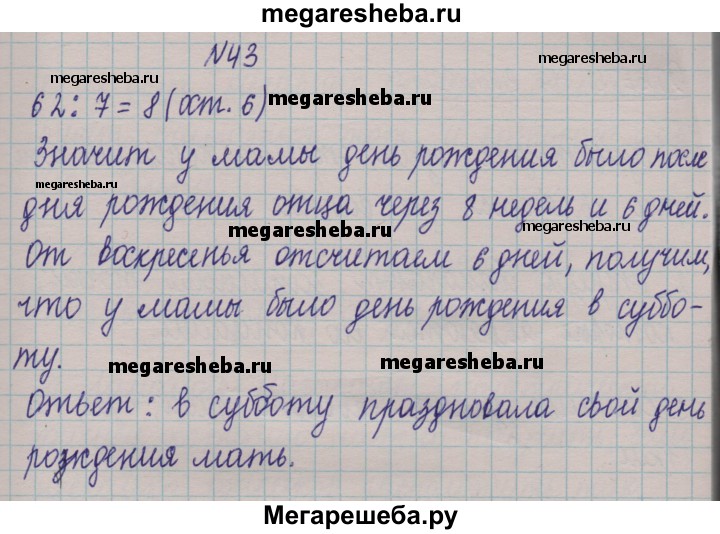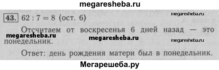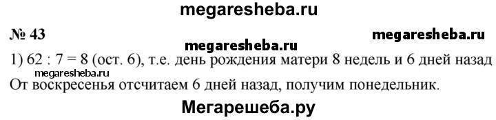 43. В этом году день рождения отца был в воскресенье. В какой день недели праздновала свой день рождения мать, если она на 62 дня моложе отца?