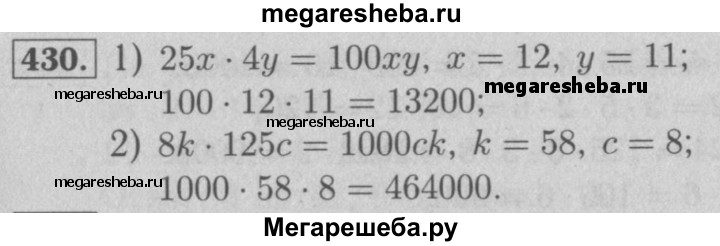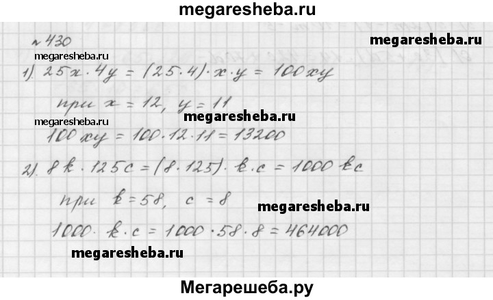 430. Упростите выражение и найдите его значение: 1) 25х • 4у, если х = 12, у = 11; 2) 8k • 125с, если k = 58, с = 8.