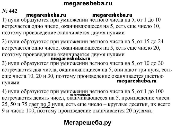 442. Сколькими нулями оканчивается произведение всех натуральных чисел: 1) от 1 до 10 включительно; 2) от 15 до 24 включительно; 3) от 10 до 30 включительно; 4) от 1 до 100 включительно?