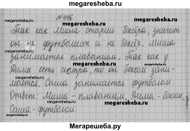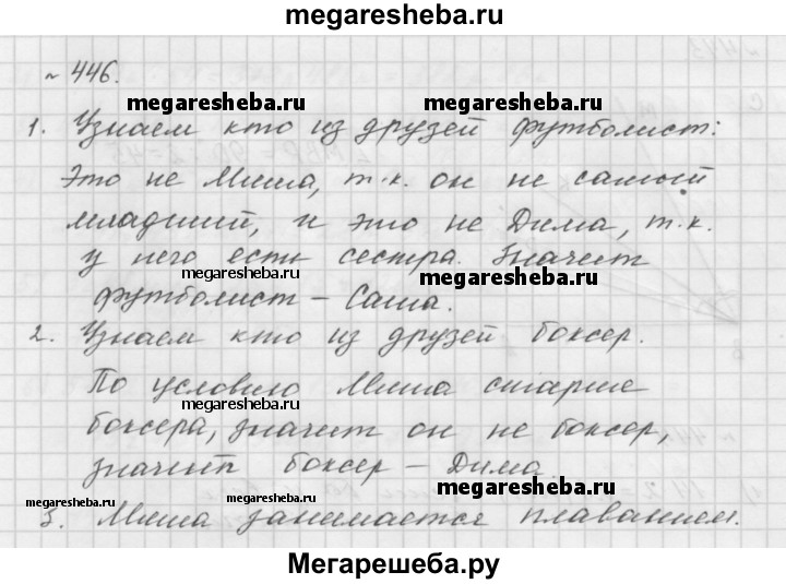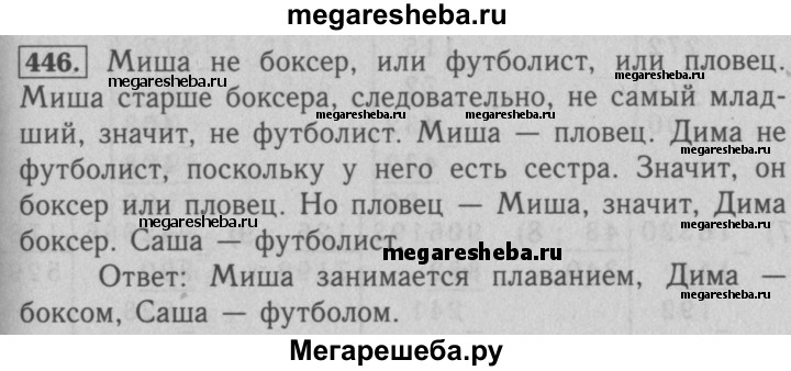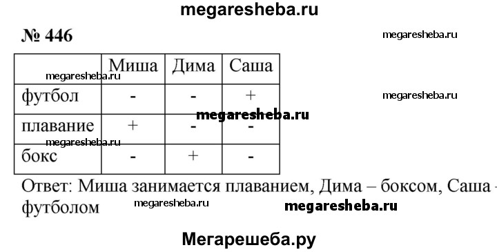 446. В 5 классе учатся трое друзей: Миша, Дима и Саша. Один из них занимается футболом, второй — плаванием, а третий — боксом. У футболиста нет ни брата, ни сестры, он самый младший из друзей. Миша старше боксёра и дружит с сестрой Димы. Каким видом спорта занимается каждый из друзей?