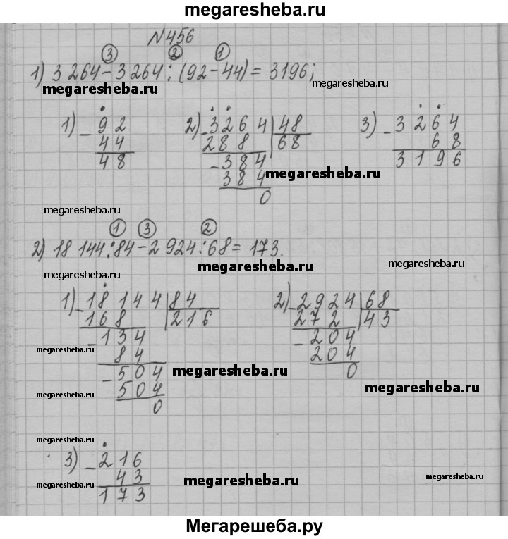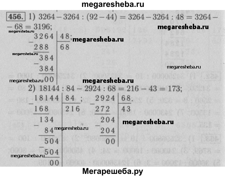 456. Найдите значение выражения: 1) 3 264 - 3 264 : (92 - 44); 2) 18 144 : 84 - 2 924 : 68.