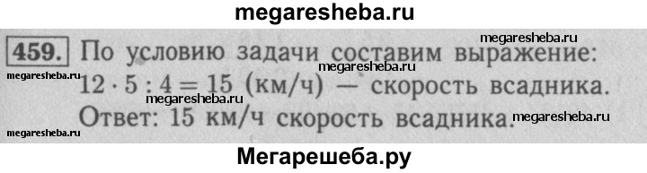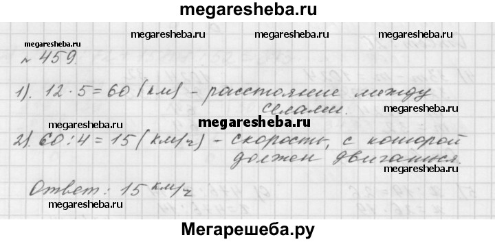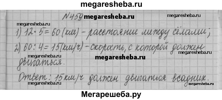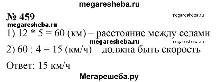 459. Всадник преодолевает расстояние между двумя сёлами за 5 ч, если двигается со скоростью 12 км/ч. С какой скоростью он должен двигаться, чтобы преодолеть это расстояние за 4 ч?