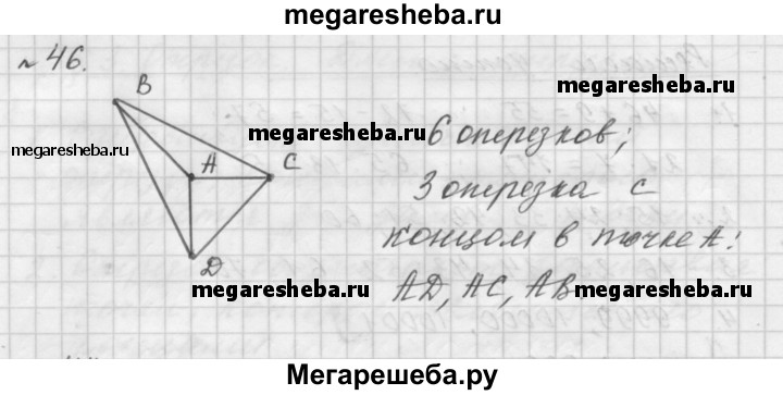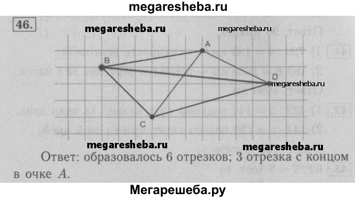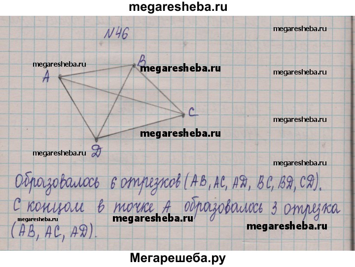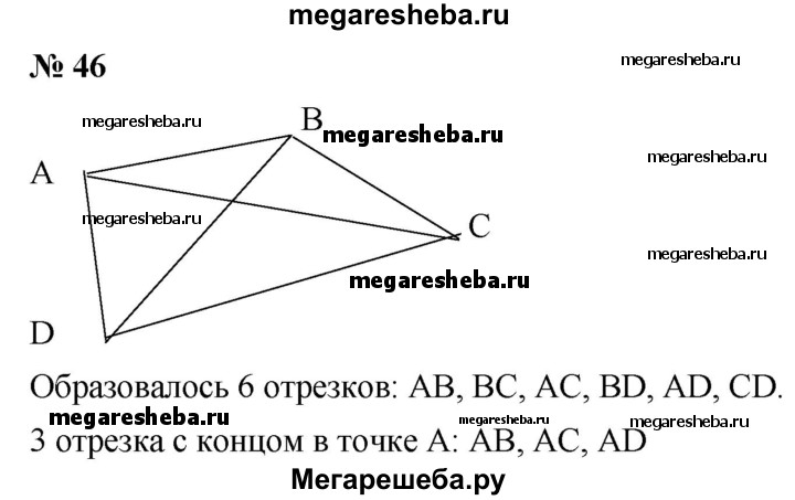 46. Отметьте в тетради точки А, В, С, D и соедините их попарно отрезками. Сколько отрезков образовалось? Сколько образовалось отрезков с концом в точке А?