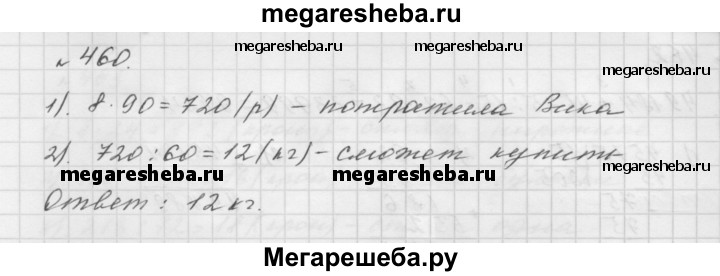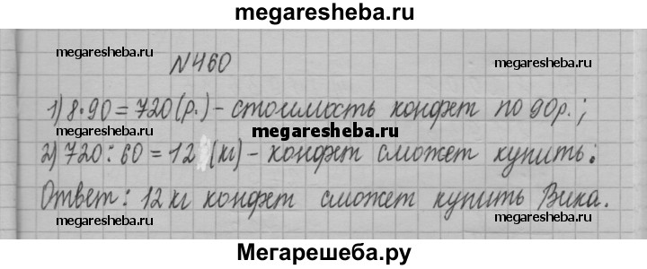 460. Вика купила 8 кг конфет по 90 р. за килограмм. Сколько килограммов конфет по 60 р. за килограмм она сможет купить за эти же деньги??