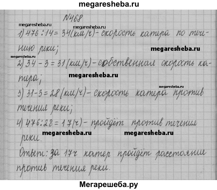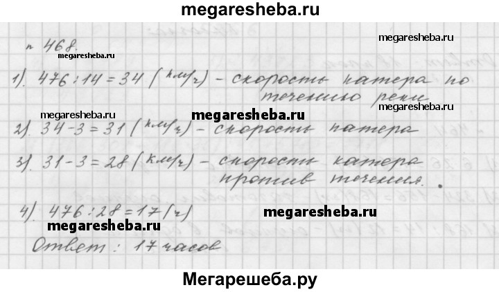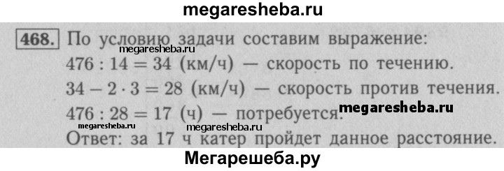 468. Расстояние между двумя пристанями равно 476 км. Двигаясь по течению реки, катер проходит это расстояние за 14 ч. За сколько часов он пройдёт это расстояние против течения реки, если скорость течения равна 3 км/ч?