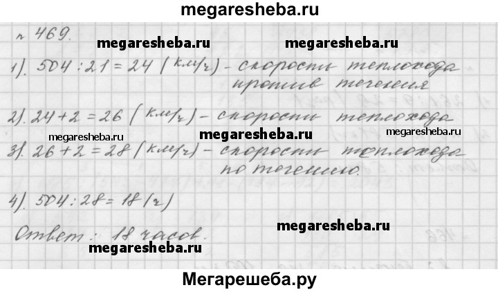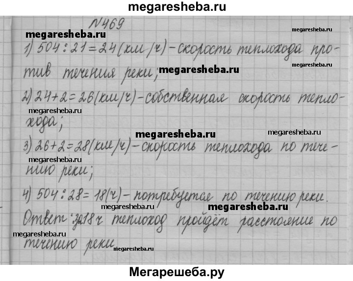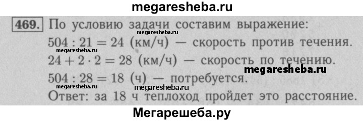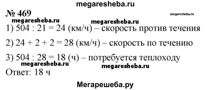 469. Расстояние между двумя портами равно 504 км. Двигаясь против течения реки, теплоход проходит это расстояние за 21 ч. За сколько часов он пройдёт это расстояние по течению реки, если скорость течения равна 2 км/ч?
