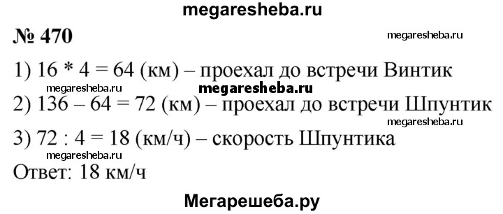 470. Из Цветочного и Солнечного городов, расстояние между которыми равно 136 км, выехали одновременно навстречу друг другу Винтик и Шпунтик. Винтик двигался со скоростью 16 км/ч. С какой скоростью ехал Шпунтик, если они встретились через 4 ч после выезда?