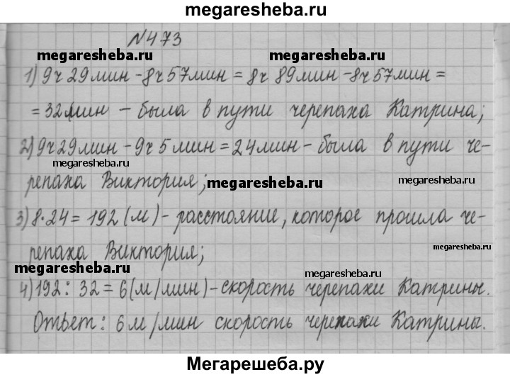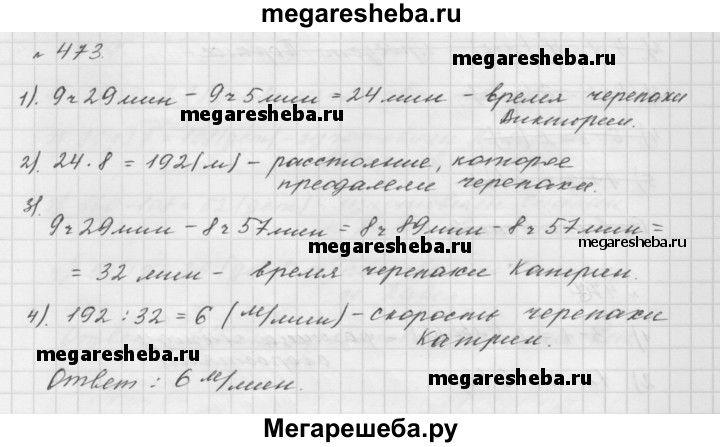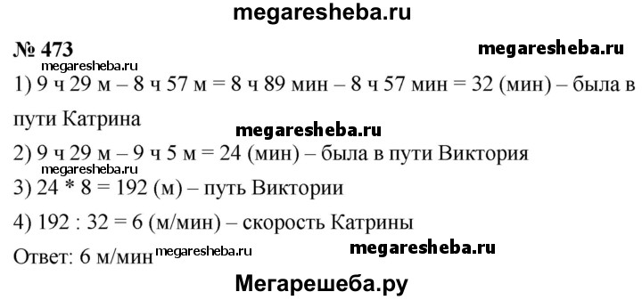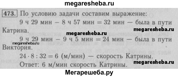 473. В 8 ч 57 мин черепаха Катрина отправилась в путешествие из своего пруда в соседний. В 9 ч 5 мин из этого же пруда в том же направлении отправилась черепаха Виктория и догнала Катрину в 9 ч 29 мин. Найдите, с какой скоростью двигалась Катрина, если известно, что Виктория двигалась со скоростью 8 м/мин.
