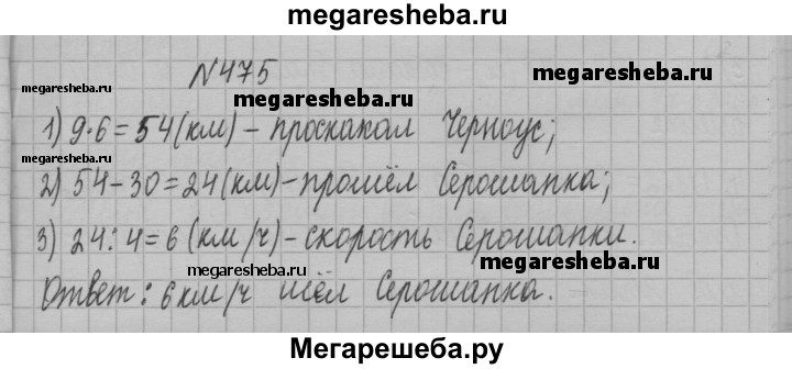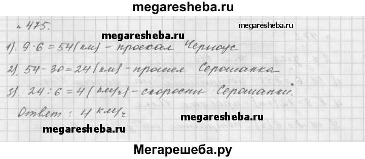 475. Расстояние между сёлами Грушевое и Яблоневое равно 30 км. Из этих сёл одновременно в одном направлении отправились казаки Серошапка и Черноус. Черноус скакал на коне со скоростью 9 км/ч и через 6 ч после начала движения догнал Серошапку, который шёл пешком. С какой скоростью шёл Серошапка?