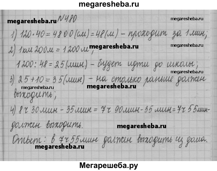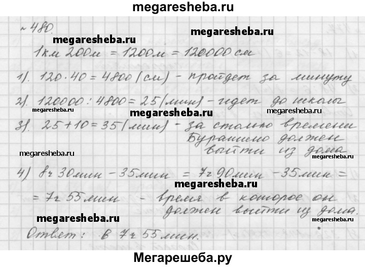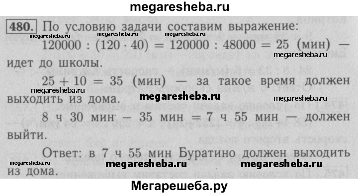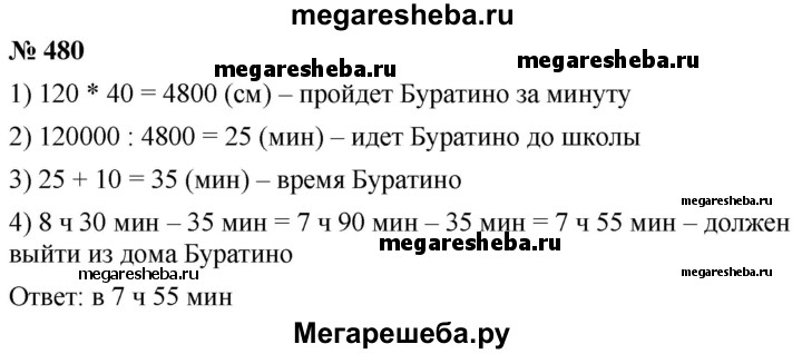 480. Буратино живёт на расстоянии 1 км 200 м от школы. Уроки в школе начинаются в 8 ч 30 мин. Буратино делает за минуту 120 шагов, длина шага — 40 см. В котором часу Буратино должен выходить из дома, чтобы приходить в школу за 10 мин до начала занятий?