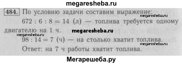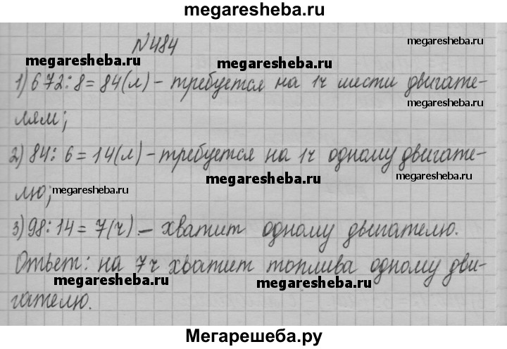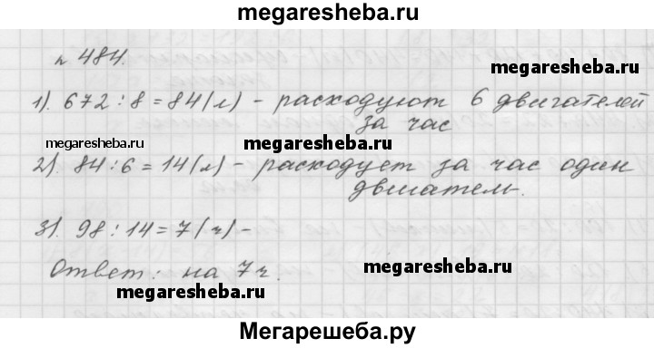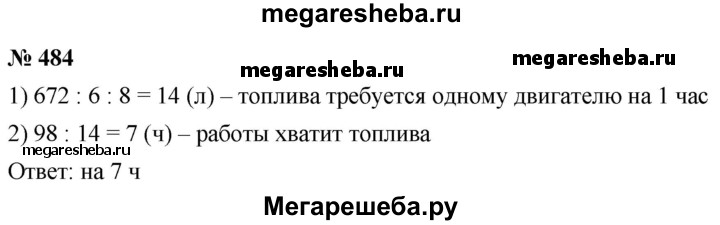 484. Для работы шести одинаковых двигателей в течение 8 ч требуется 672 л топлива. На сколько часов работы хватит 98 л топлива одному такому двигателю?